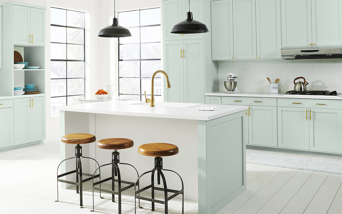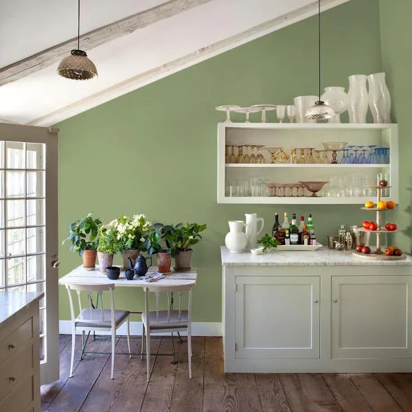 Olive Sprig做為空間的主色調即可營造一個安心休憩的場所,在島台或較低的廚櫃上與黃銅色調和木質色調(於PPG2022年色彩趨勢調色板中可選擇)即可搭配出完美的視覺呈現。