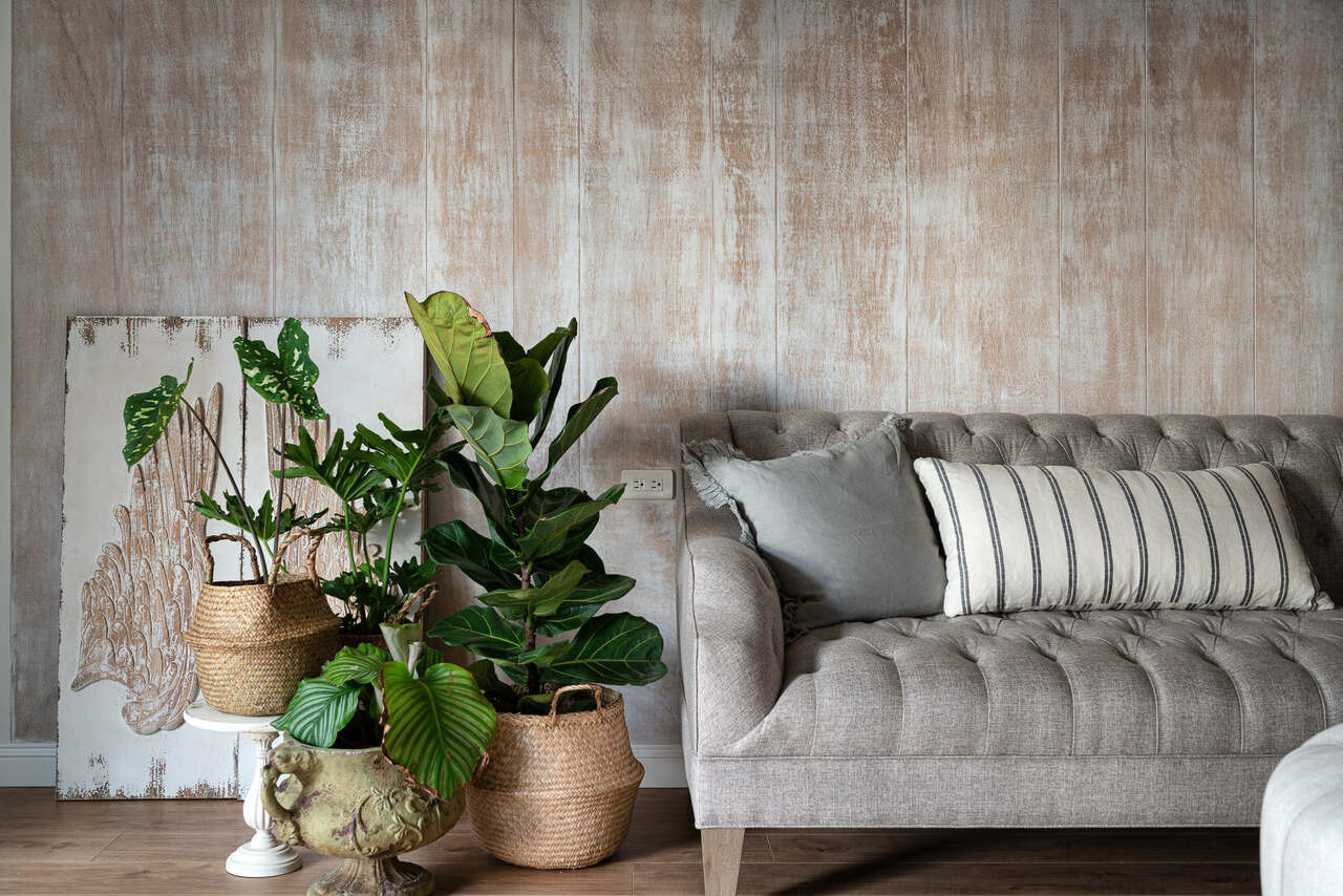 植栽帶來的活力事半功倍,柔美的花卉在桌面創造焦點,輕易延伸出佈置,中大型的植栽與斗櫃搭配,創造出舒服的綠化層次感。