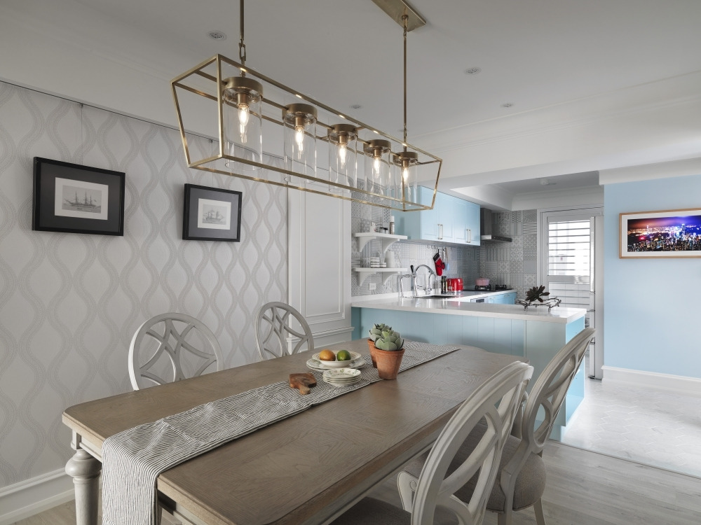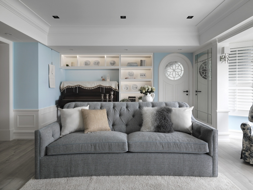 以桑貝繪本「戴眼鏡的女孩」為設計發想理念,在線條與色彩另一面,蘊含著四季的節慶,選用童話故事中的青鳥幸福藍,傳遞溫馨的信息。用木材質搭配溫柔色調,透過光線營造童趣森林系居家感。而古典拉扣沙發獨有的特色在於外表設計成收束邊,包覆在沙發外皮上,這樣的工藝技法需要豐富經驗,也是一種非常仰賴師傅手工技術,極耗時費工的一項工法。