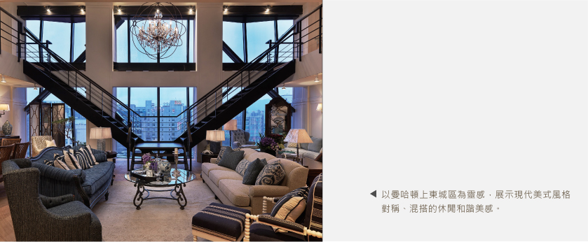 餐廳以ART DECO風格吊燈取代傳統水晶燈,風格和代表摩登美式的Ralph Lauren餐桌椅、Hickory Chair餐邊櫃相近,締造雋永氣息。