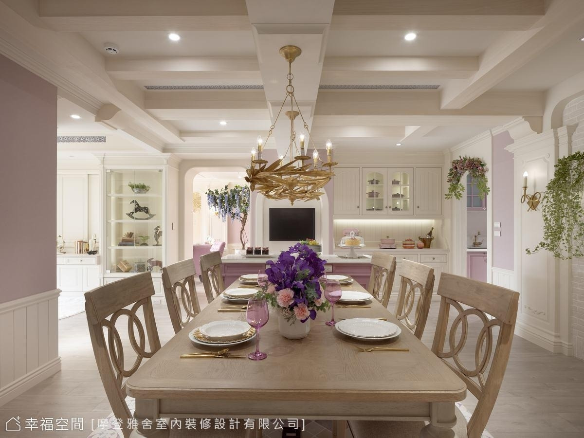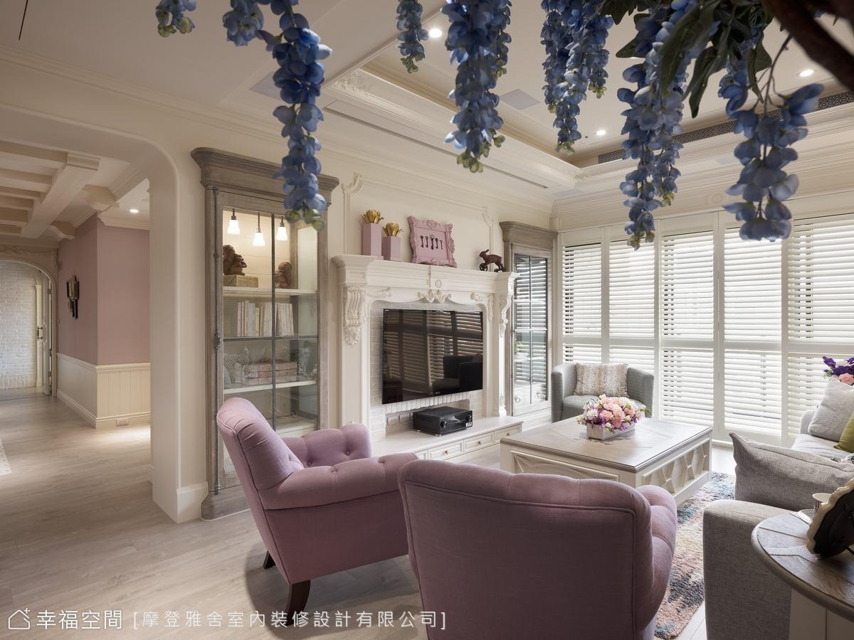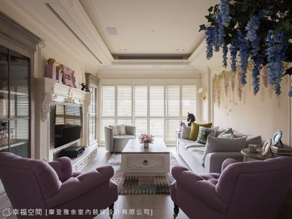 設計師巧手彩繪的紫藤花牆,象徵美好與光明,垂墜的花束流洩,搭配溫馨的美式風格家具,療癒身心靈。