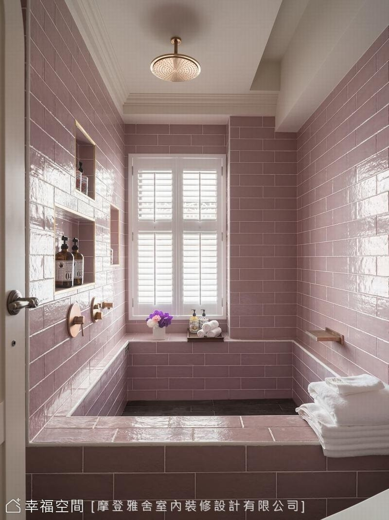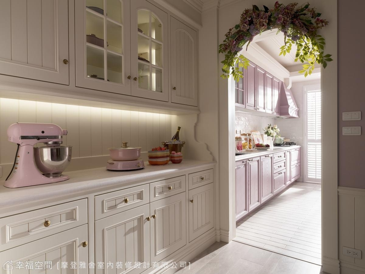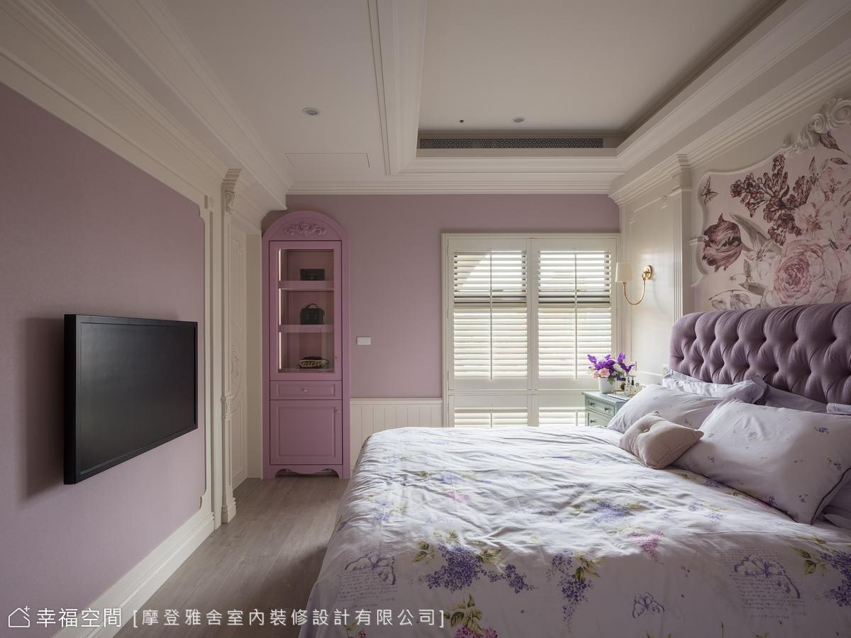 設計師巧手彩繪的紫藤花牆,象徵美好與光明,垂墜的花束流洩,搭配溫馨的美式風格家具,療癒身心靈。
