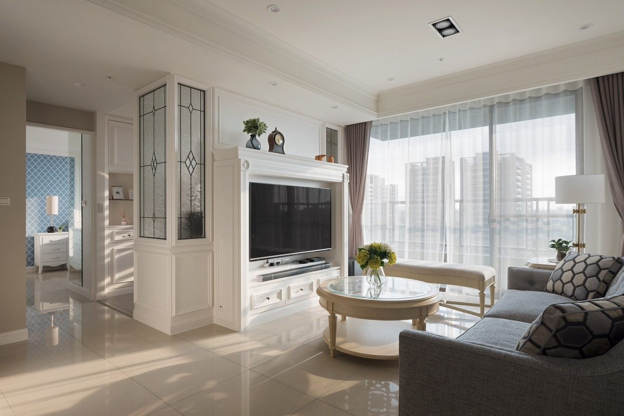 - 落地窗前用線條優雅的長椅凳取代厚重主人椅