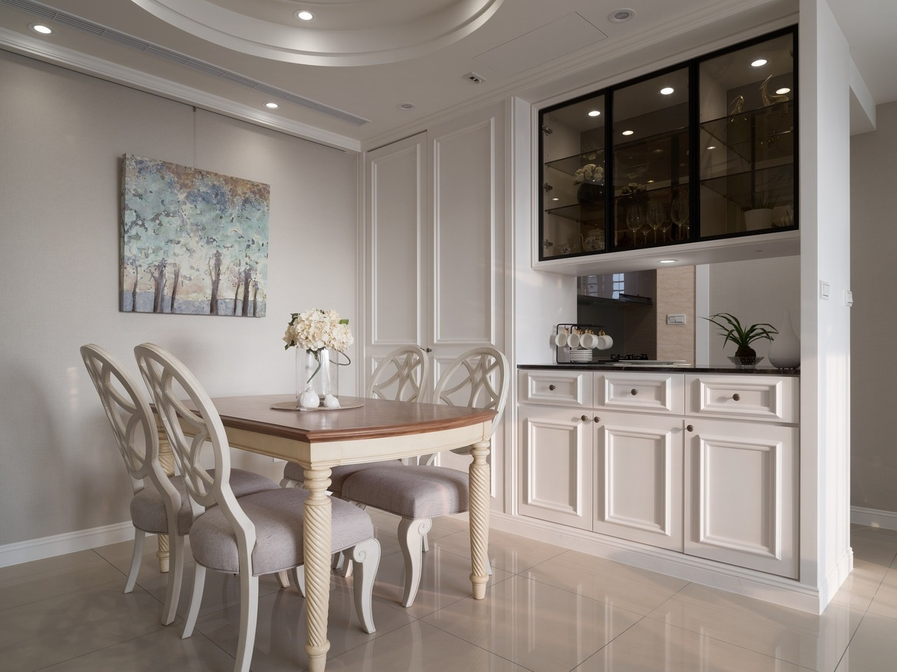 - 美式雙色餐桌搭配鏤空圓背餐椅,呈現視覺穿透感