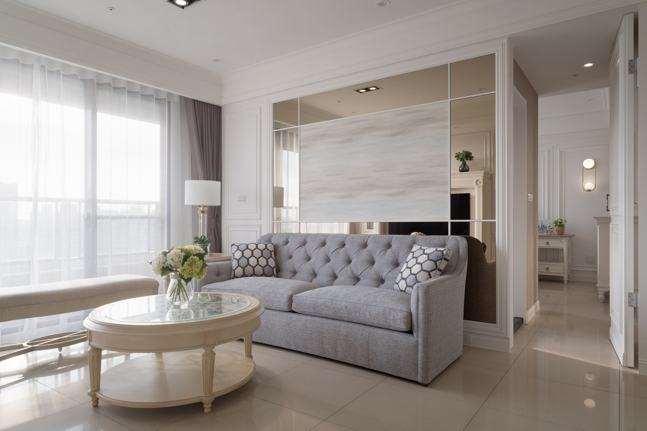 - 莫蘭迪灰綠色三人沙發建構起整間的法式風格,優雅細緻的絨布拉釦,薄框式扶手更顯輕巧