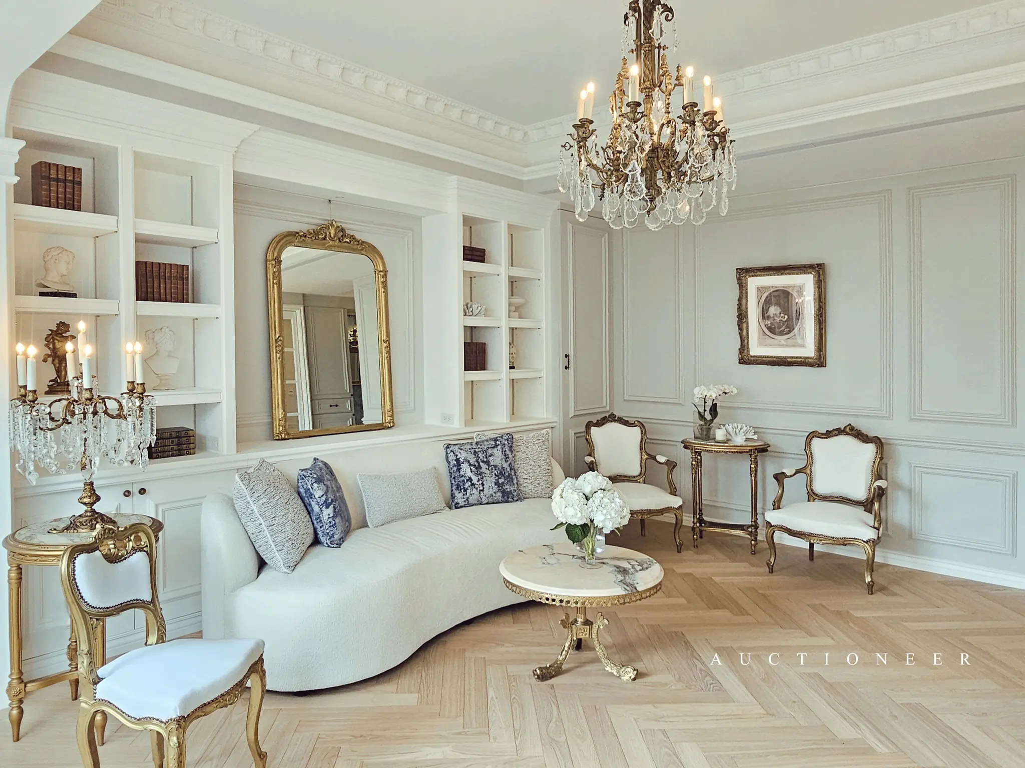 設計師選擇了一款具有流線感的現代沙發,搭配經典的古董家具,例如雕花木質桌椅、復古鏡面邊櫃等,讓整體視覺在對比中展現和諧感。 - 法式經典與當代設計結合