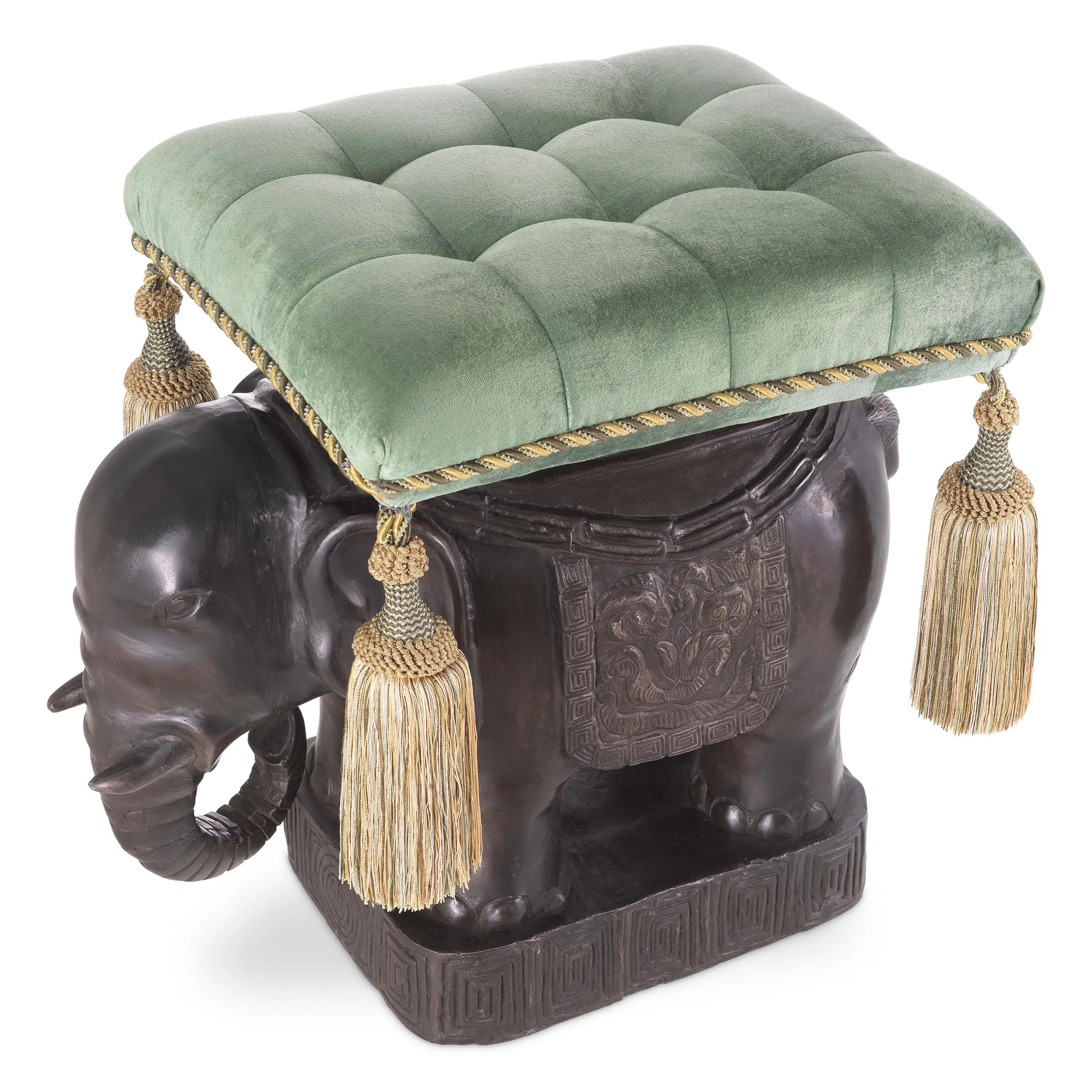 🔍 首頁 線上商城 客廳 凳 椅凳/大象 Stool Elephant bronze 現貨| RH-EH-117870 椅凳/大象 Stool Elephant bronze 尺寸(cm): 40W x 58D x 55H 加入最愛加入最愛 描述 Elephant 凳以青銅色呈現,喚起異國旅行的壯麗氛圍。精緻工藝打造的象雕藝術,為居家空間增添高貴氣息。搭配青綠色座墊與絲質流蘇,使此凳成為兼具奢華與藝術感的焦點單品。