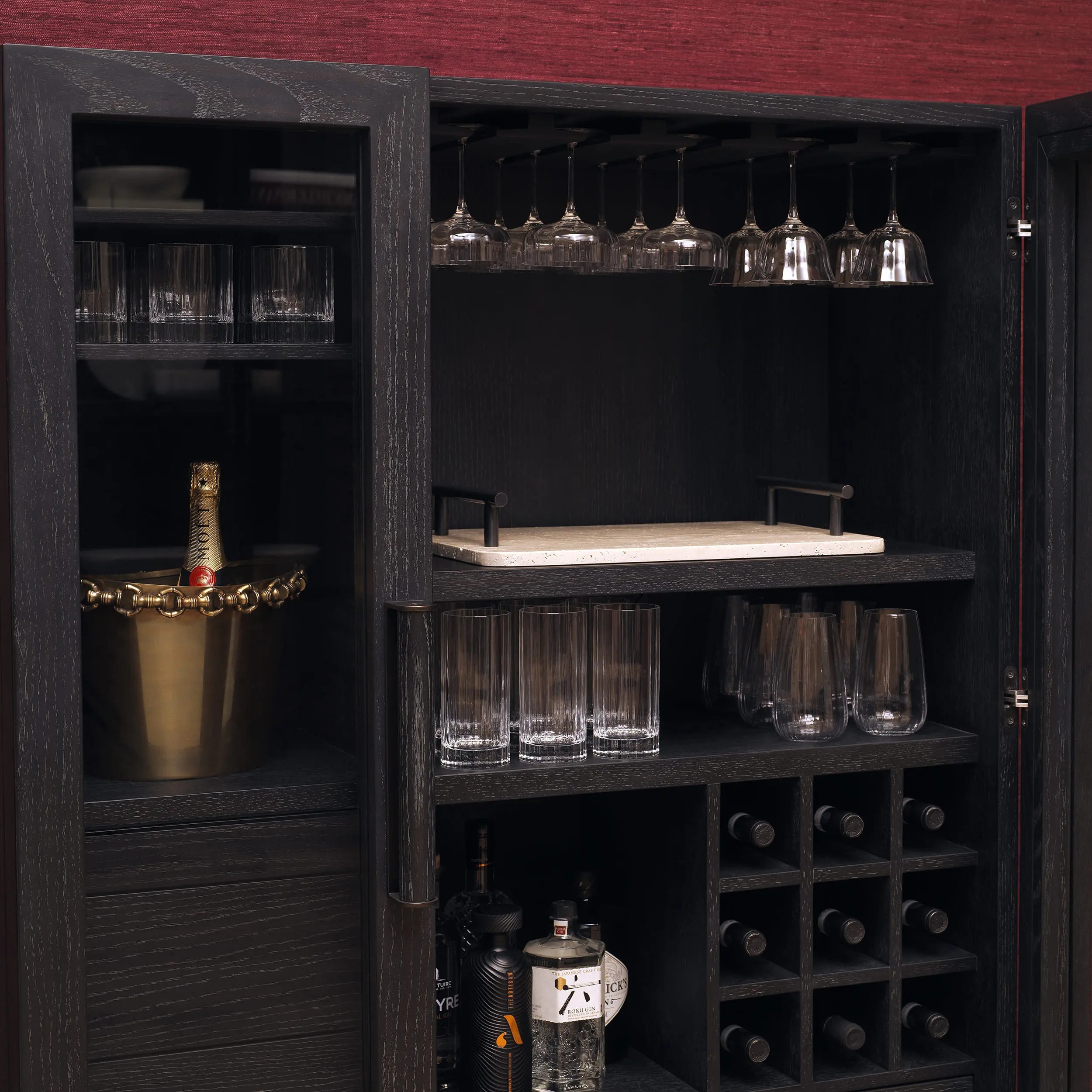 🔍 首頁 線上商城 餐廳 邊櫃/酒櫃 Bar Cabinet Connaught charcoal grey oak veneer bronze finish 現貨| RH-EH-119054 邊櫃/酒櫃 Bar Cabinet Connaught charcoal grey oak veneer bronze finish 尺寸(cm): 110W x 60D x 150H 加入最愛加入最愛 描述 Connaught 酒櫃散發精緻優雅氣息。深灰色橡木紋理搭配奢華銅色細節,呈現高貴格調。雙透明玻璃門與多功能收納設計,將實用性與奢華完美融合,是高端居家或商業空間的理想收藏單品。