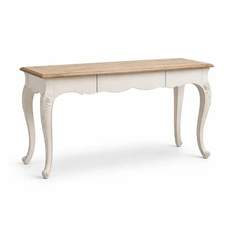 細緻雕刻桌腳搭配柔和奶油白色基底,勾勒出輕盈而典雅的輪廓;原木色檯面則增添自然層次,讓空間更顯溫暖沉穩。