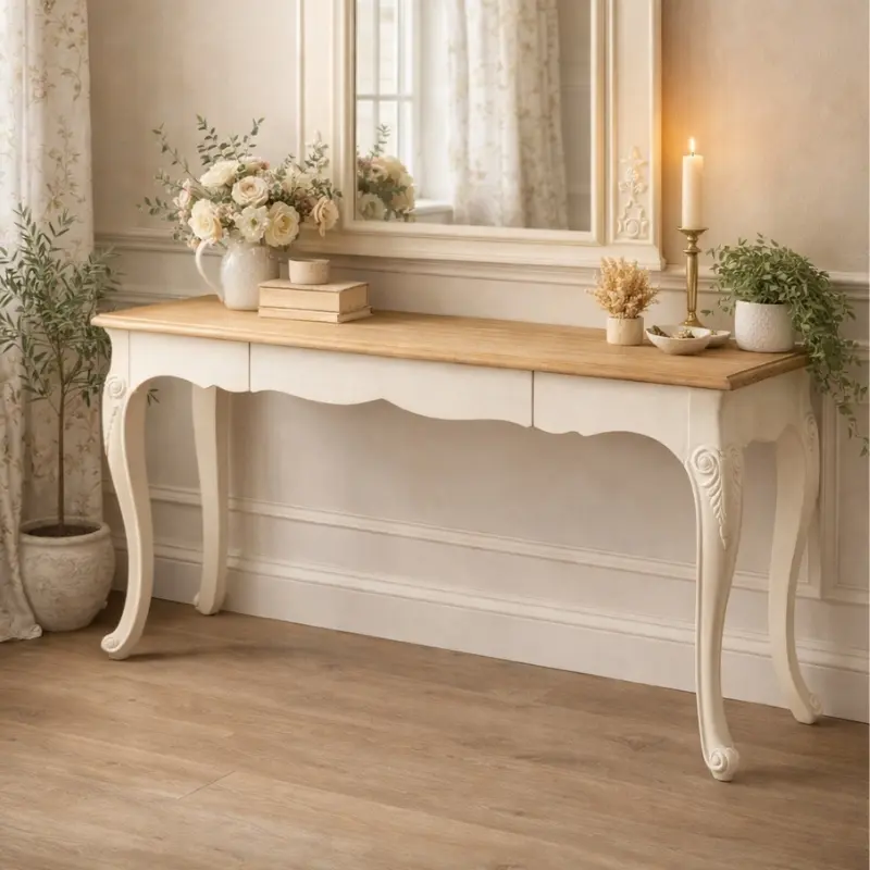「CLEMSON 玄關桌/沙發背几」以優雅法式線條與溫潤木質檯面,詮釋經典與實用兼具的居家美學。