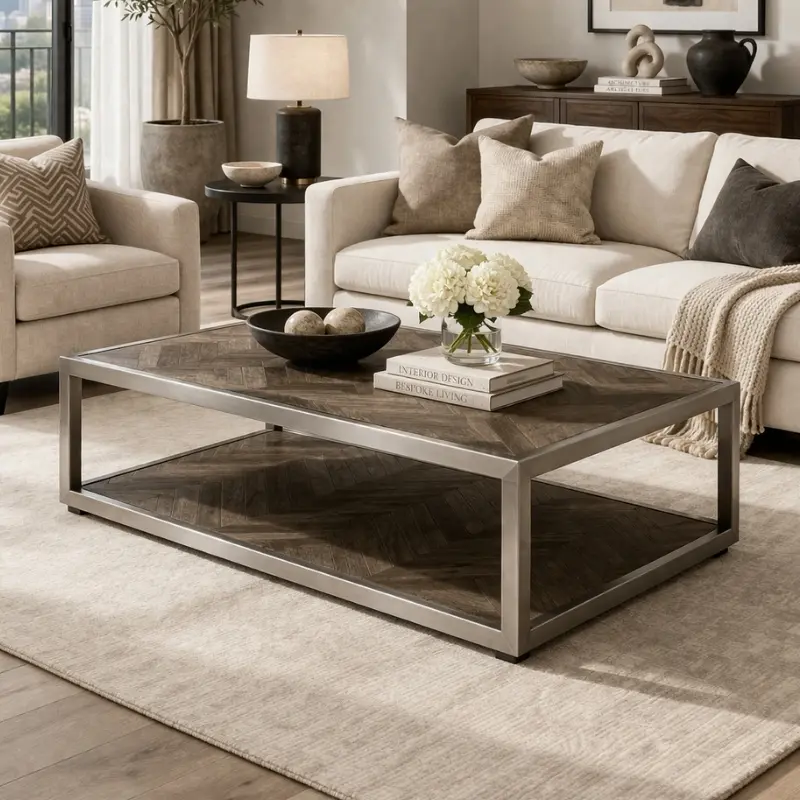 這款「大茶几-仿舊橡木」以人字拼木紋結合仿舊刷色工藝,呈現層次豐富的自然紋理,低調卻耐看。 俐落金屬框架結構,提升整體穩定度與現代感;上下雙層設計,兼顧展示與收納,讓客廳維持清爽有序。適合現代輕奢、美式家具、都會風格空間,輕鬆成為視覺焦點。 無論擺放書籍、茶具或裝飾品,都能營造沉穩溫潤的生活氛圍。 ➤ 預約實體參觀