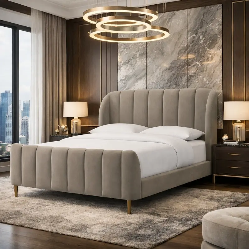 靈感源自 1940 年代藝術裝飾風格,其獨特的弧形床頭板營造出柔和流暢的線條,搭配垂直車縫設計,增添精緻細膩的格調。這款床架不僅外觀高貴典雅,更能為臥室空間帶來復古與現代融合的魅力。無論是打造華麗的主臥房,還是營造時尚舒適的休憩環境。