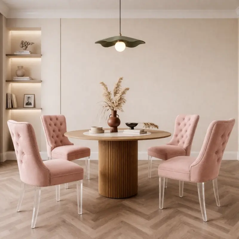 Jen 餐椅以細膩的微弧曲線勾勒出迷人輪廓,椅背採用傳統的手工拉扣技術,呈現出優雅的鑽石菱格紋,將深邃的立體感與卓越的舒適性完美結合,結合壓克力椅腳,成就居家空間的視覺焦點。
